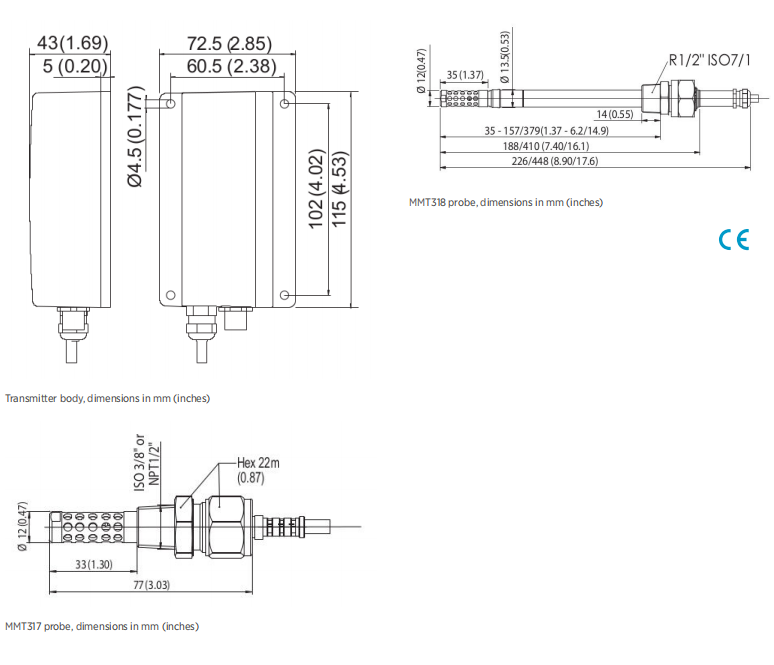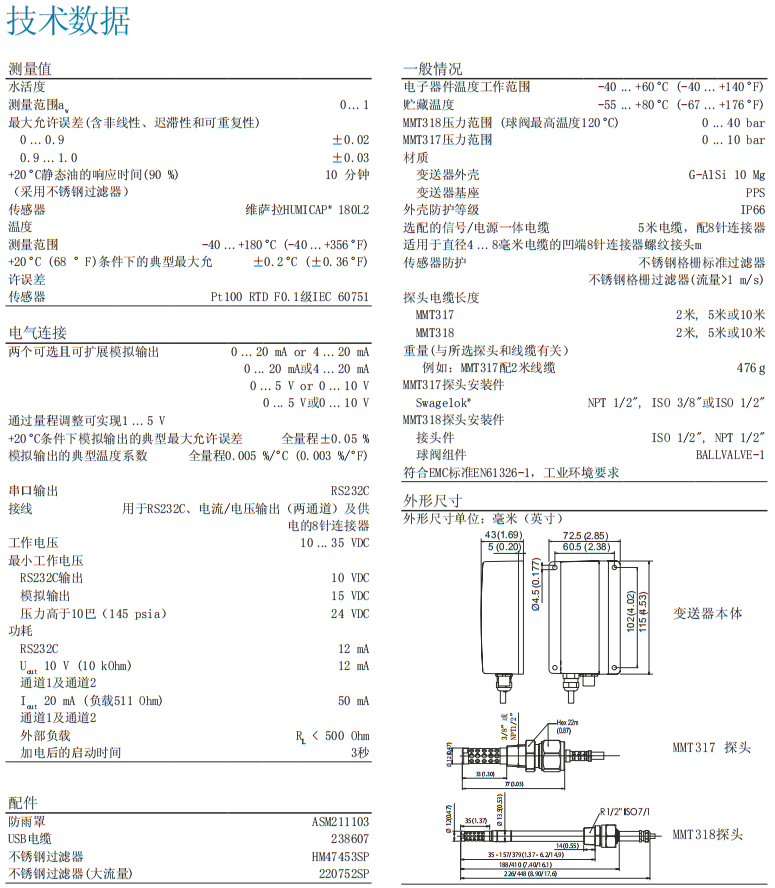 MMT318有兩種可調節插入長度的探頭。訂貨時還可以選球閥套方式,用于校準時插入或拔出濕度探頭而無需清空油路系統。MMT317 是小型壓力密封探頭,還可以選配卡套接頭( Swagelok )。