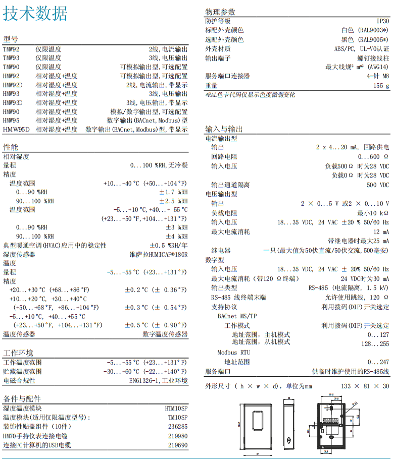 墻面安裝型維薩拉H M W90系列溫濕度變送器采用H U MICA P ?濕度傳感器,可測量具有高精度、高穩定性和高可靠性操作需求的室內暖通空調應用的相對濕度和溫度。